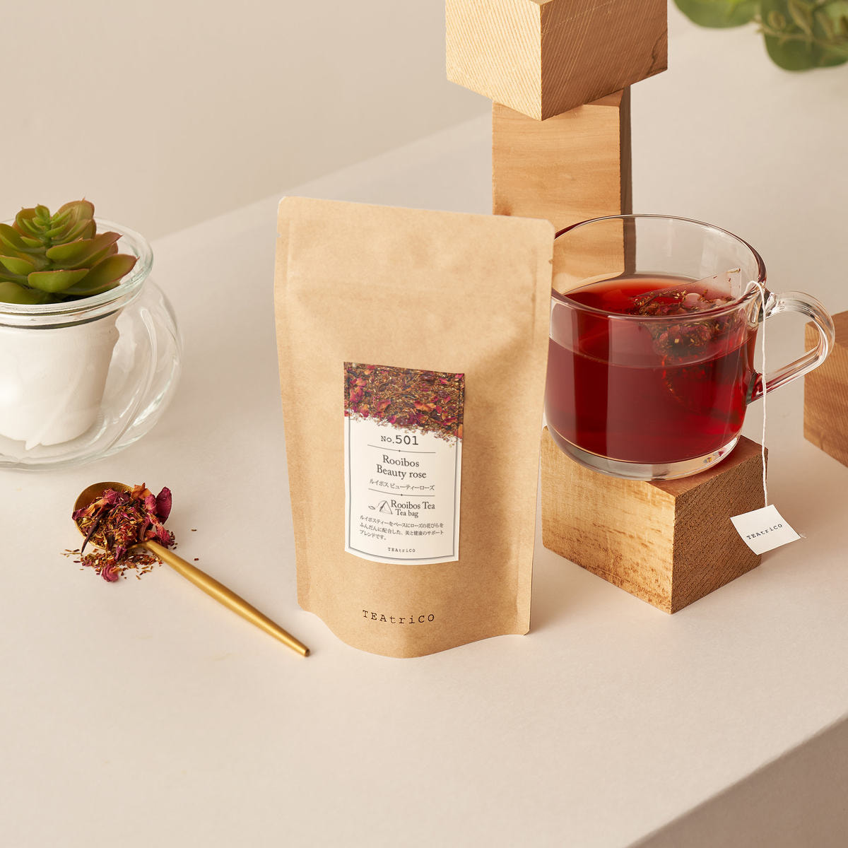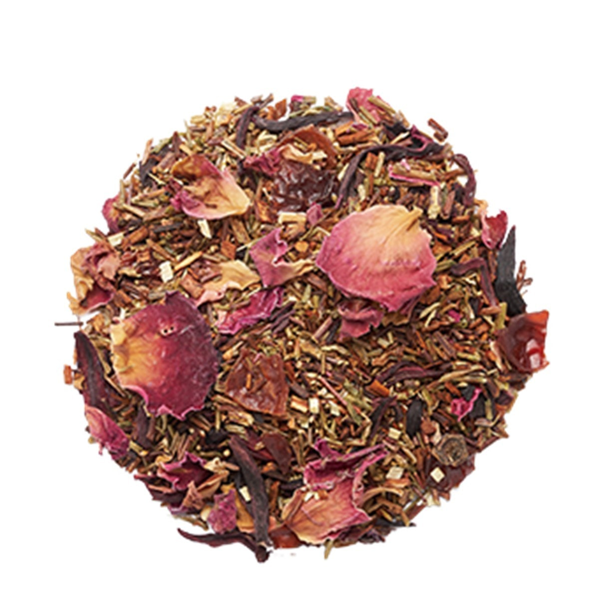 ルイボスティーをベースにローズヒップ、ハイビスカスとローズの花びらをふんだんに配合しました。