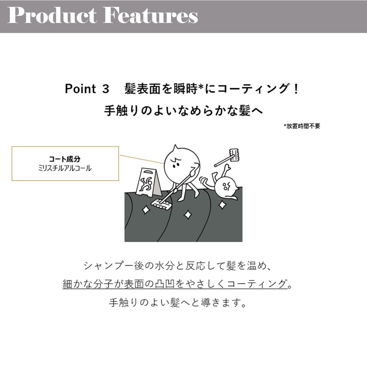 毛髪補修成分がダメージ部分に浸透し、HPM処方によって髪のツヤとサラサラ感を持続させます。